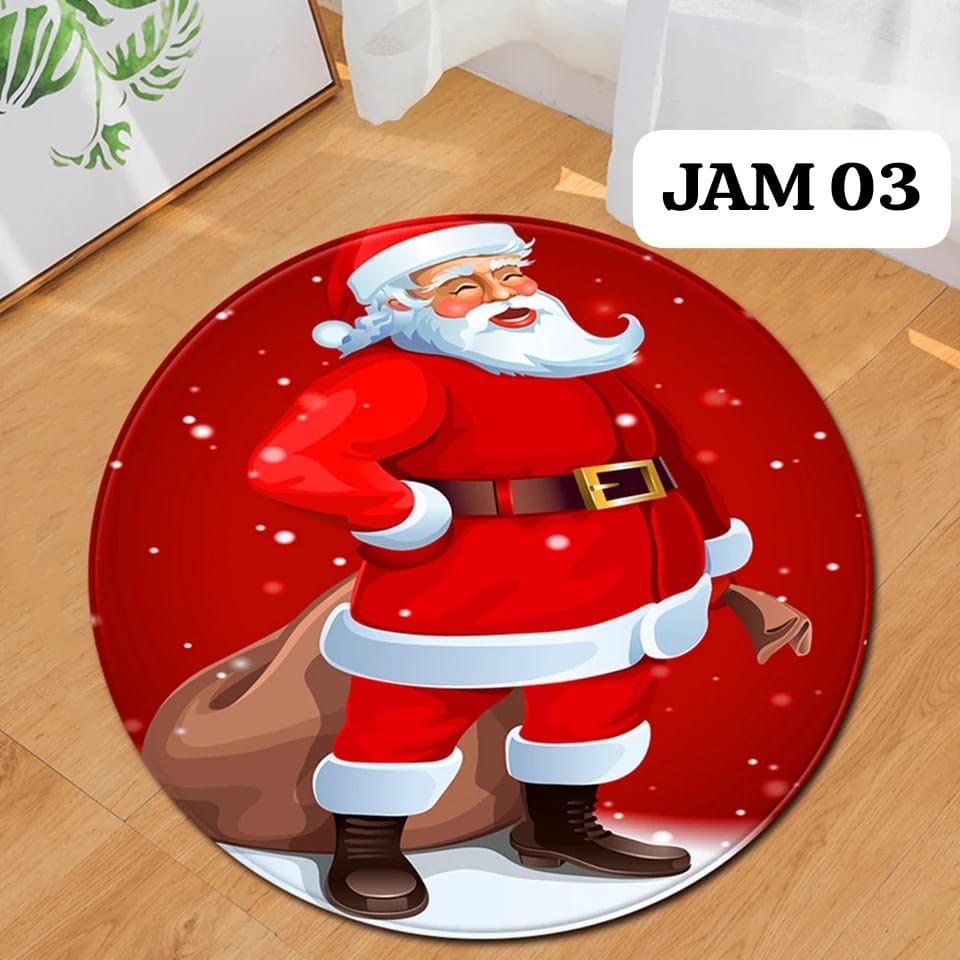 Esta alfombra redonda con diseño de Santa Claus es perfecta para crear un ambiente cálido y alegre en tu sala, entrada o junto al árbol.